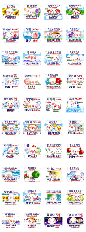 韓国語(ハングル カタカナ発音)と日本語(ローマ字発音)に英語も加えて、夏全開のイラストです。夏から初秋まで、清涼感溢れる毎日使えるスタンプをお届けします。