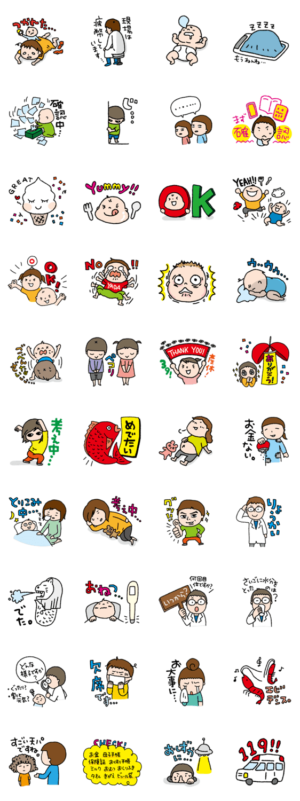 育児に関わるスタンプです。赤ちゃんのお世話をしたメモや、普段子供に接していない大人への遠隔地からの指示、お医者さんからよく聞かれる質問などを揃えました。