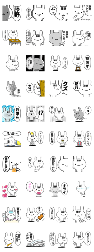 日本全国の苗字,藤野サンの人気毒舌吹き出しうさぎスタンプ!面白く,ウザく,名前が,ふじの・ふじやサンに使える!フジノさん,フジヤちゃん,フッちゃんへ♡