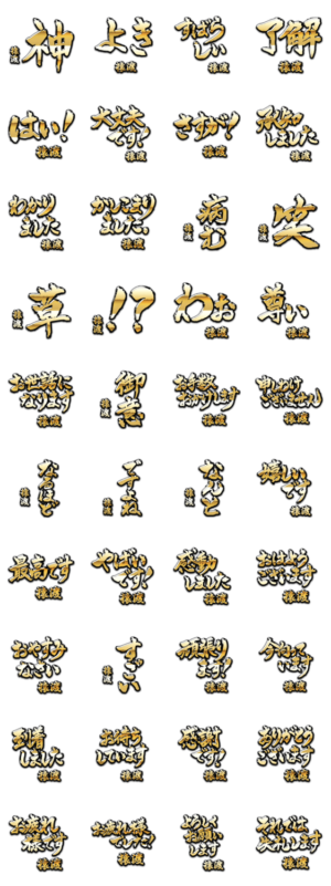 猿渡さん専用、黄金の筆文字スタンプ。キャラなし、デカ文字、ゴージャス。友達、ママ友、仕事で使えるソフトなあいさつ、敬語、丁寧語満載!JK語も収録。イッレ・コスヤ より発売