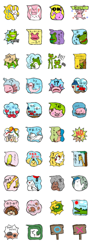 色々な動物達が吹き出しの中でゆるりと喋ってくれます♪ カエル、うさぎ、ウーパールーパー、クマ、ブタ、ネコ、インコ、ワニ、ハリネズミ、カニ、ダンゴムシなど…