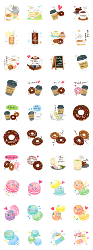 ティータイムにぴったり!文字に白フチ加工した改良版。ドーナツ、マカロン、団子に和菓子。スイーツ色々と紅茶と珈琲で大人女子向き。おやつタイムにもどうぞ。Y.Toyama より発売