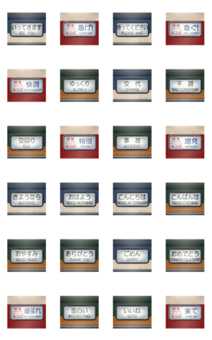 日本の電車の方向幕をデザインしました。挨拶文のバージョンです。地方の鉄道やローカル線でおなじみの色です。英語と日本語の二ヶ国語表記です。ヨシダアカリ より発売