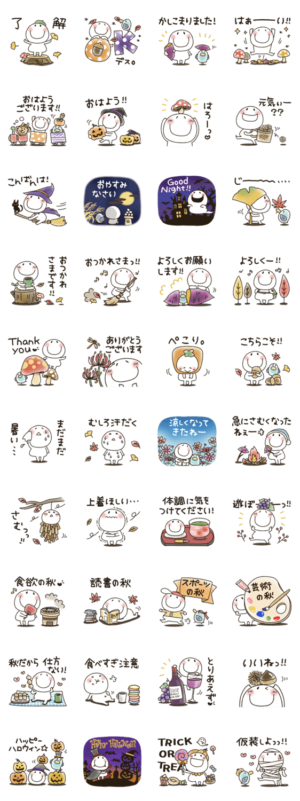まるぴシリーズ28弾、誰もが笑顔になれる白くてまるいスマイル君の秋ハロウィンバージョンです。焼き芋、かぼちゃ、どんぐり、栗、銀杏、ワイン、柿、食欲の秋など。かなぴ より発売
