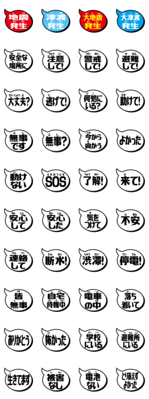地震のとき、緊急時でも簡単に連絡がとりやすいようにシンプルなスタンプです。ひらがな表示もしておりますので老略男女問わず誰でも使いやすくしております。