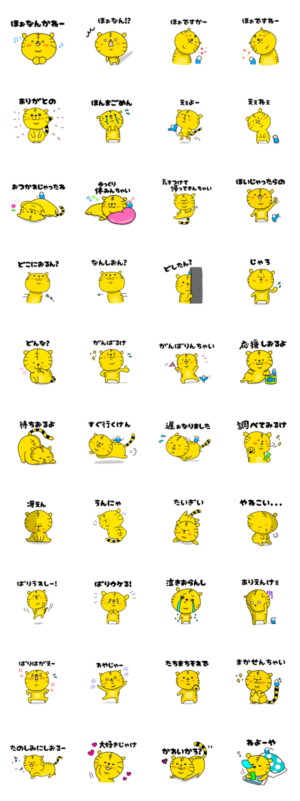 広島弁を話す虎のスタンプです。猫のような虎に加え、時々セキセイインコが登場します。もちゃんふ より発売