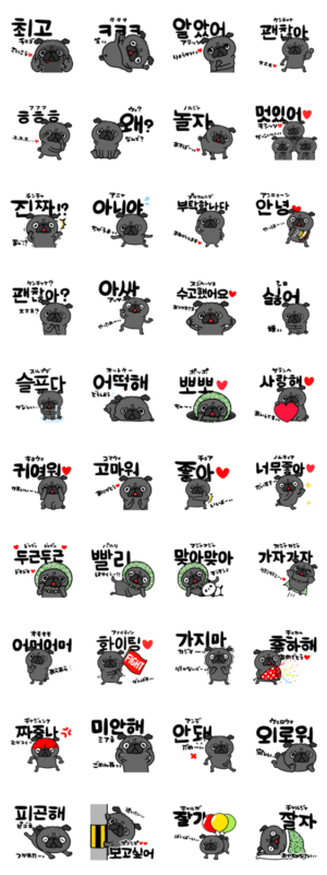 韓国語と日本語 黒パグさん スタンプ画像一覧
