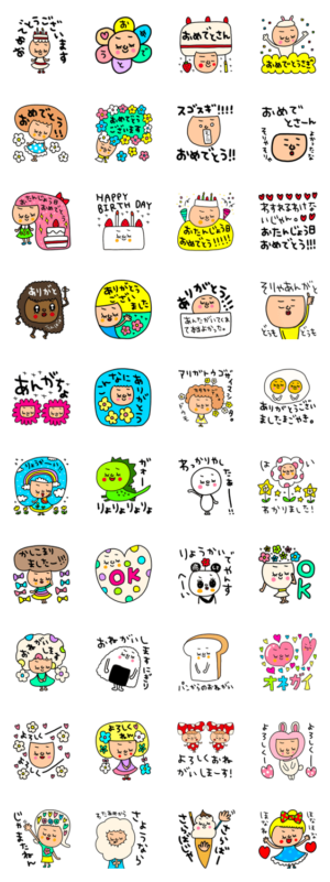 おめでとう多めでセットにしました。ありがとう、返事、よろしく。さようなら。でセットにしましたー!かわいいものからシュールなものまで。使えるスタンプです。