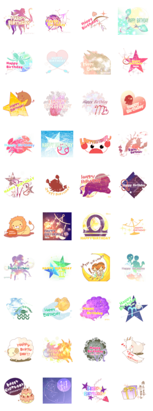 誕生日のお祝いに使える星座スタンプ。星座ごとに3種類とおまけの4種類。家族、友達、彼氏、彼女など、大事な人に送る誕生日メッセージと一緒に使って頂けたら嬉しいです。