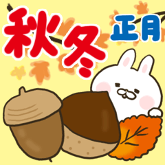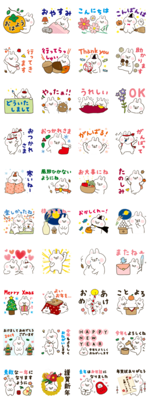お月見、運動会・ハロウィンやクリスマスなどのイベントに使える秋冬バージョンの出っ歯うさぎです。お正月のあけおめスタンプ入りで長く使えます♪
