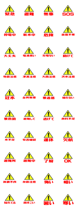 地震や大雨等による災害時に使えるスタンプです。 停電等で充電が少ない場合、スタンプ1個で安否確認ができます。