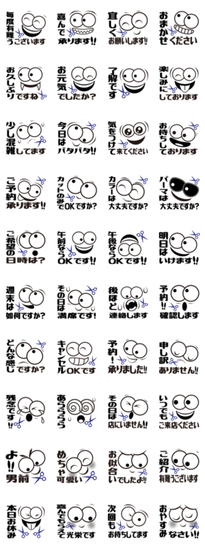 デ顔絵の男性美容師編です。散髪屋さん床屋さん美容師さんお客様との予約のやり取り等に使いやすくわかりやすいシンプルなスタンプです。理容・美容問わずお使いください