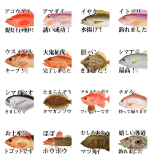 釣りや水辺遊びで、魚を発見、ゲットしたときにつぶやけるスタンプです。仲間や家族にスタンプを送って釣果、成果を自慢しよう! 船釣り、ショアジギ、大物釣り師にも!