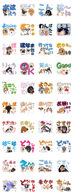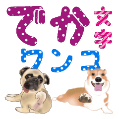色々なワンコの「でか文字」基本セットです。でかい文字で選びやすく、ワンコ好きの皆さんにお勧めのスタンプです。Masajii より発売