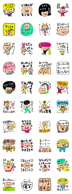 前向きなスタンプ。元気付けてあげてください。よく使う言葉でセットにしましたー!かわいいものからシュールなものまで。