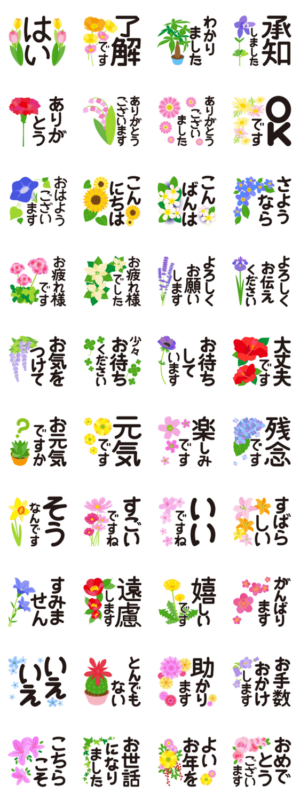 縦書きで上品。文字の大きさも工夫されていて読みやすい。ふざけた感じが一切ないので相手を選ばないスタンプです。植物の絵もかわいい。