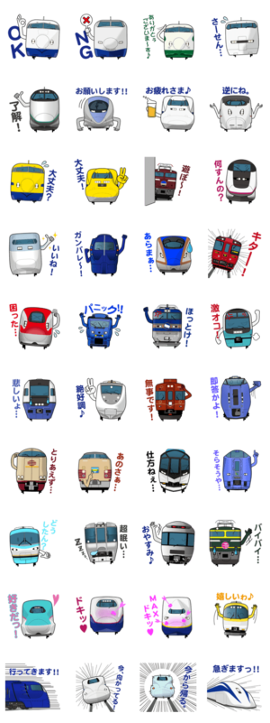 表情を持たせた新幹線や電車のイラストに、日常会話や列車名をモジッた言葉を掛け合わせました。鉄道ファンにはたまらないスタンプです!