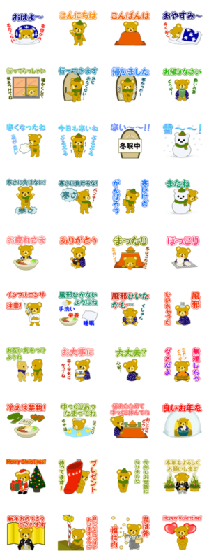 雪だるま・こたつ・鍋・お餅・お汁粉・風邪への配慮等の冬のいろんなシーンや、クリスマス・お正月・節分・バレンタインデーにもどうぞ。文字大きめです。