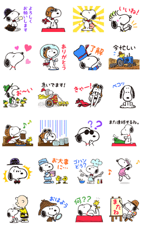 スヌーピーは変装の名人!おなじみのフライング・エースを始め、世界的に有名な弁護士や小説家、探偵まで☆スヌーピーがいろいろな変装をしてスタンプに登場!!初の日本語文字入りで使いやすさもアップ♪楽しいスタンプでトークをさらに盛り上げよう!