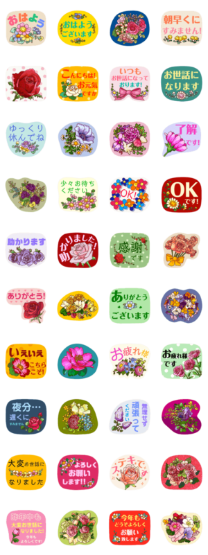 毎日使えるスタンプに、花束を多めに盛り込んでみました!新年のご挨拶入りです。