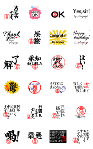 時には真面目に時には力強く、時にはオシャレに時にはかわいく。はんこメインのデカ文字、青柳(あおやぎ)さんスタンプです。