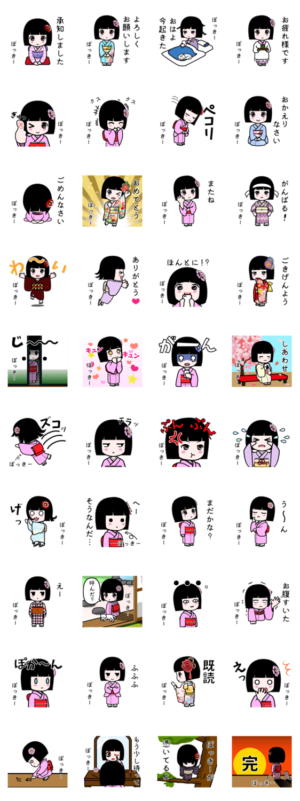 『ぽっきー』用のよく使う言葉を詰め合わせた座敷童子のスタンプです。和服 着物 振袖かがりひな より発売