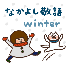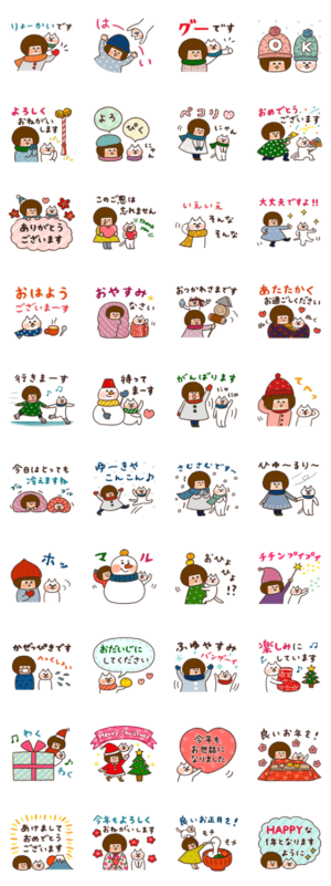 文字が見やすくなりました☆おかっぱハナちゃんとネコの冬&年末年始に使える敬語スタンプです。雪の日はおそろいのマフラーでルンルン♪疲れた時はおでんでひと休みです。