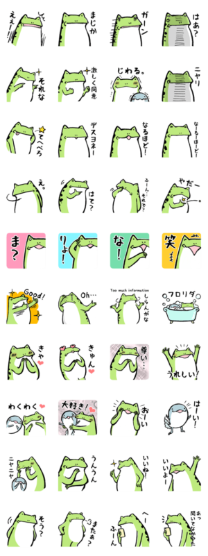 鳥獣戯画チックなカエルが、貴方の素直な気持ちをシュッと代弁します。子ガエルやオタマジャクシもいます。