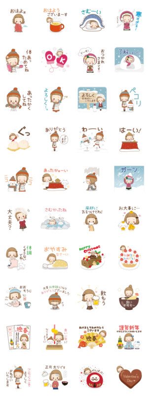 前髪パッツン振りは激しいけど、冬のニット帽が良く似合って可愛い女の子のスタンプです。