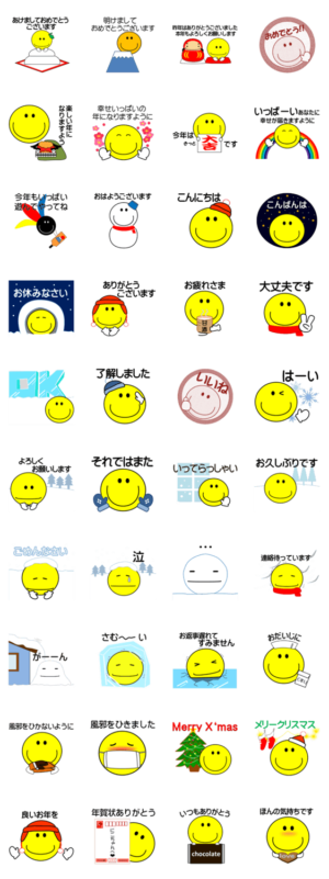 年賀の挨拶、年賀状、雪、風邪、バレンタイン、クリスマス、大みそかなど冬のイベント満載! 大きな文字で人の優しい日常会話のスタンプ。 にこちゃん(スマイル君)