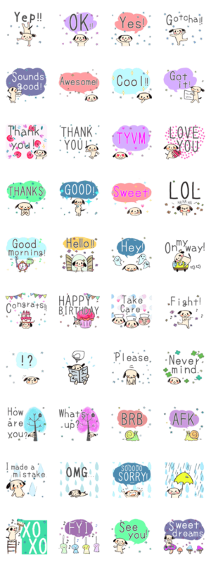 日常英会話で使えるかわいい犬の英語スタンプです。簡単な単語からネイティブっぽいスラング&略語も盛りだくさんです!犬好きの方にもオススメです♪ /English ver./dog/
