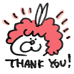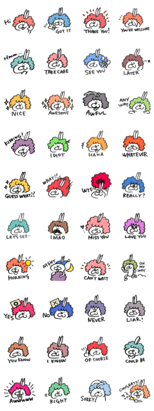 ポップなアフロを身に付けたうさぎのスタンプ。英会話で使いやすい表現を集めました。留学や外国の方とのコミュニケーションなどに。