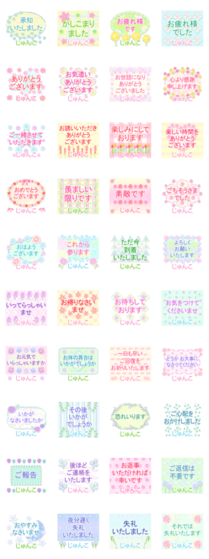 よく使う敬語とじゅんこさんの名前入り。お花と柄で大人の方もお使いいただけます。お礼,お見舞い,挨拶,連絡,返事,仕事や学校,ママ友,親戚関係等にお使いくださいませ。Black Pansy より発売