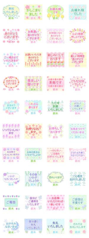 よく使う敬語と鈴木さんの名前入り。お花と柄で大人の方もお使いいただけます。お礼,お見舞い,挨拶,連絡,返事,仕事や学校,ママ友,親戚関係等にお使いくださいませ。Black Pansy より発売