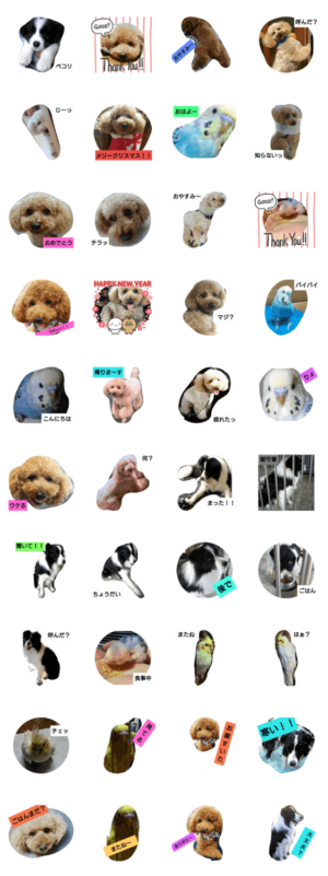 我が家のペット達で作ったスタンプです。蓮くん、モモちゃん、ココちゃん、くーちゃん、シェルくん