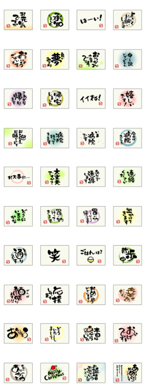 中高年、シニアも使えるように大き目の文字にしました。挨拶、お礼、病院など日常の出来事を筆文字アートで表現。ポストカード感覚で使えます♪