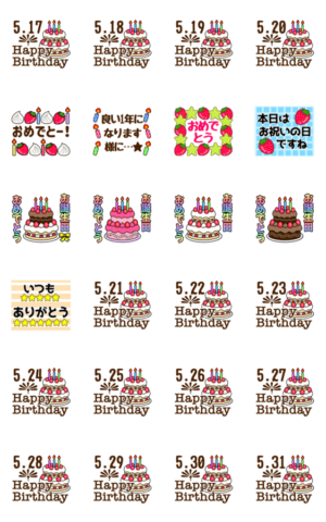 祝いたい生まれ月を入れて【まつこの◯月お祝い】で検索。5月17日〜31日お誕生日を祝うスタンプ/ハッピーバースデー/happy birthday cake/ケーキ/に贈る/送る/動くMatsuko2016.11 より発売