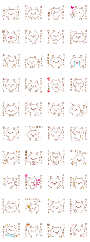 ともだち、家族、恋人など、大切な「けいまくん」へ送る、ウサギの名前スタンプです。けいま/ケイマ/恵万/繋馬/桂馬/けい馬/けいま君
