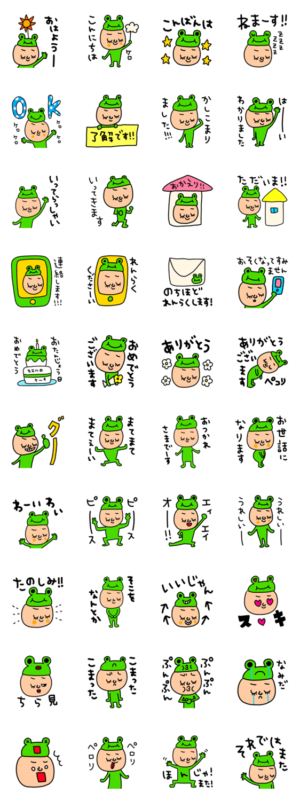 カエルののスタンプ。よく使う言葉でセットにしましたー!かわいいものからシュールなものまで。riekim より発売