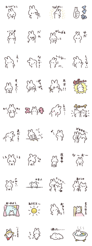 うさぎさんの第二弾。 クレヨンみたいなペンを使い見やすくしました。線の色は黒に近いこげ茶なので、くっきりしつつ少し柔らかい雰囲気になります。ネコも出てきます。ミケうさぎ より発売