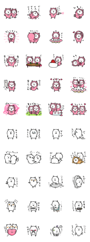 ピンクタイツのくまカップルがいます。らぶらぶなシーンが多く、恋人同士の会話に最適です。よしゃよしゃと慰めるくまがお気に入りです。