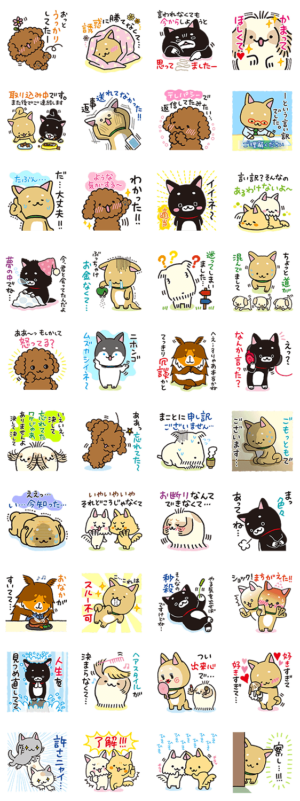 「いいわけん」第3弾のスタンプはおともだちわんこも一緒にいいわけ!ふだん使いのいいわけから、逆にいいわけされた時の返事まで、トークに合わせて使ってね♪