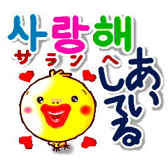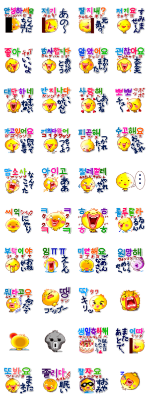 韓国語(ハングル カタカナ発音)と日本語のカラフルな大きな文字で、表情豊かなヒヨコがかわいく、使いやすいスタンプです。