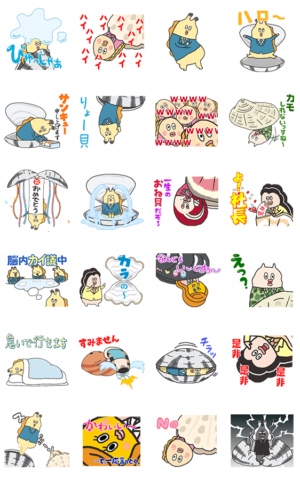 ウザかわいい!映画館でお馴染みの、ダメな会社員のキャラがスタンプに。おなじみのアサリやハイ貝もいるよ。DLE より発売