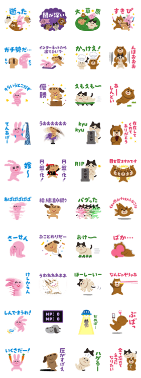いらすとやのウサギとイヌとネコとクマのキャラクターがみんなで楽しそうに遊んでいるスタンプです。みふねたかし より発売