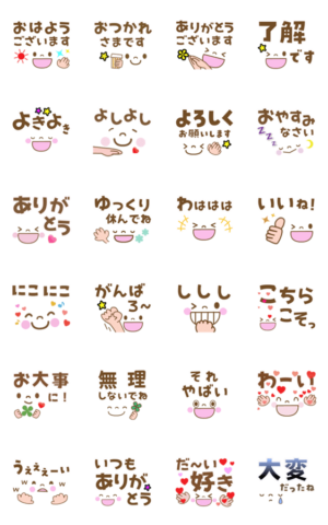 相手が落ち込んだり病気の時に使える、「よしよし」「お大事に」や「無理しないでね」などの癒しと、日常の挨拶やお礼も大きなデカ文字とシンプルな顔で気持ちが伝わる!mtorak より発売