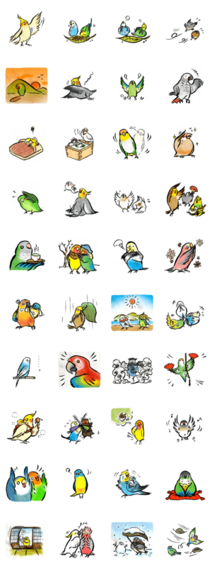 どこか和風な小鳥たちのスタンプです。(たまに大型もいるよ!)セキセイインコ、オカメインコ、コザクラインコ、文鳥など、様々な鳥ちゃんてんこ盛りでお届けします。パヒロ より発売