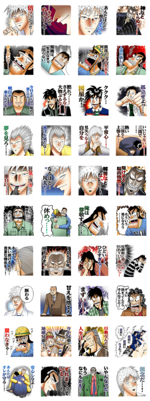 福本伸行作品の名シーンを集めた、逆境に勝てる名言スタンプが登場!アカギ、黒沢はもちろん、涯や零などの名キャラクターが勢揃い!Fukumoto Production/highstone, Inc. より発売