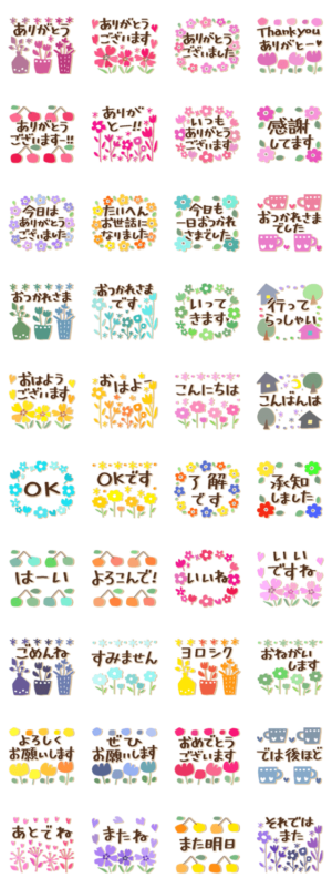 感謝の言葉とよく使う言葉を集め、北欧風の花で春っぽく飾った大人かわいい40個。シンプルなイラストと見やすいデカ文字です。