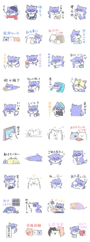 いつもちょっぴり気だるげな顔をしたオオカミの大上くんと、もふもふなポメラニアンとサモエドによって構成されたけだまーずのスタンプ第2弾。冬に使えるものが多めです!